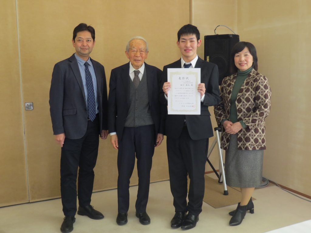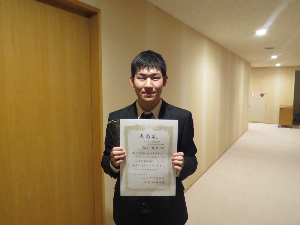 くらしき作陽大学 音楽学部 演奏芸術コース 管楽器・打楽器専修 1年生舩引稜太さんのコンクール入賞者表彰式が行われました。舩引さんは、第45回ジュニアクラシック音楽コンクール(金管楽器部門:トロンボーン)において優秀な成績を収めました。おめでとうございました。