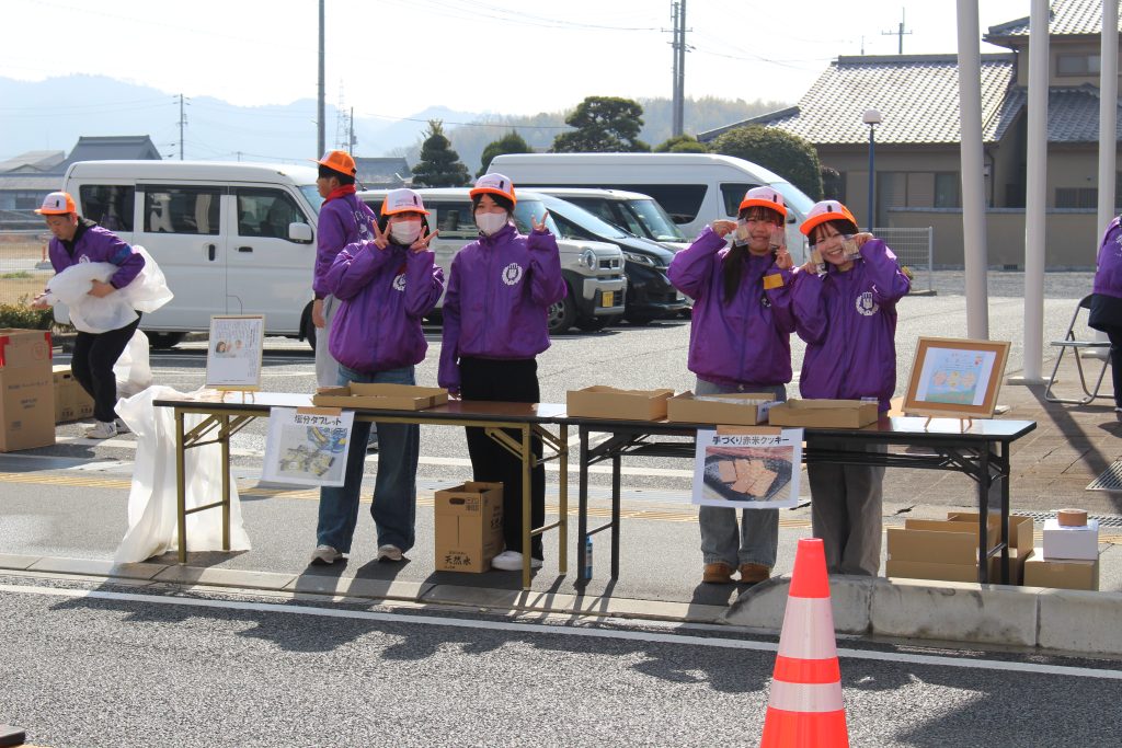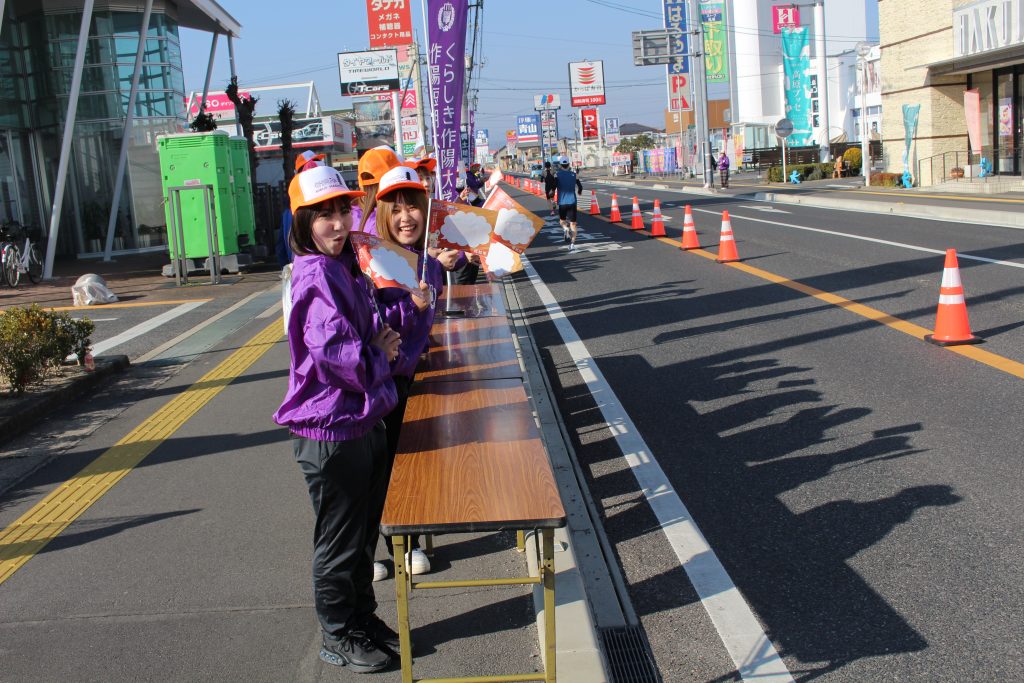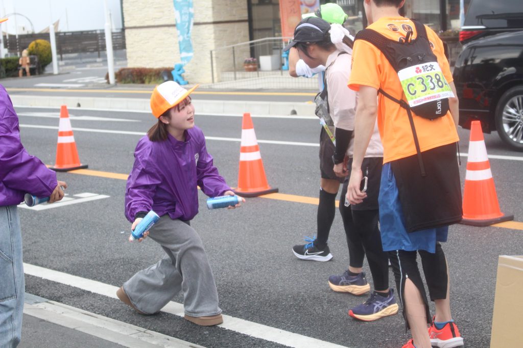 給水所で「お水」の提供や、給食所で食文化学部が商品開発し販売されている「手作り赤米クッキー」、「塩分タブレット」の提供を行いながら、ランナーの皆さんに声援を送りました。