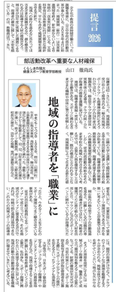 山陽新聞「提言2026」欄に、くらしき作陽大学 健康スポーツ教育学部の山口徹尚教授が寄稿しました。