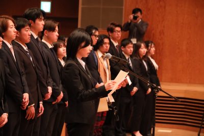 松田学長をはじめ、来賓の方々からもお祝いの言葉をいただき新入生の皆さんを歓迎しました。 また、新入生を代表して健康スポーツ教育学部の白井杏奈さんが宣誓を行い、学生生活への意気込みを述べました。 皆さんの情熱と好奇心が、この学び舎で大きく花開くことを教職員一同楽しみにしています。